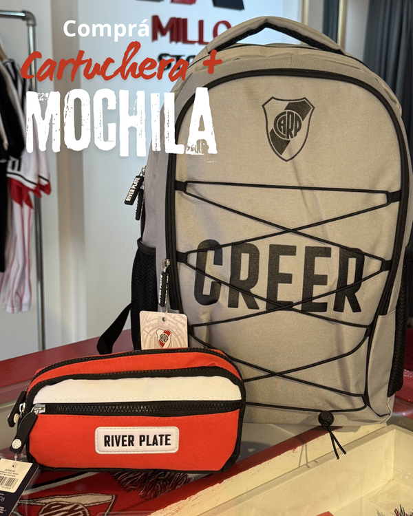 Mochila River plate Creer más cartuchera River Plate oficial, reforzada, dos compartimentos, cierres. Más botella con pico y tapa antiderrame de Regalo.